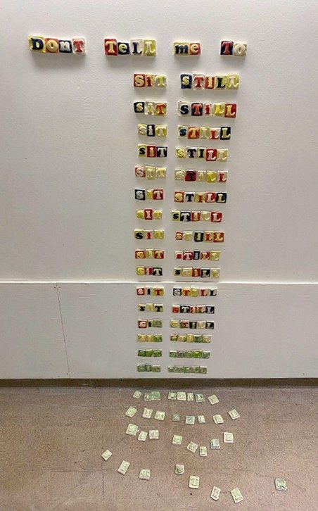 This piece is both a protest against the phrase and a physical representation of how it manifested inside me. The words “sit still” are repeated 20 times, one for each year I have been in school. This piece is hung at eye level and drips down the wall and onto the floor. The bottom tiles fade into a mossy green (moonellis glaze) to represent that while I no longer repeat these words to myself as much, they have been permanently engraved internally.