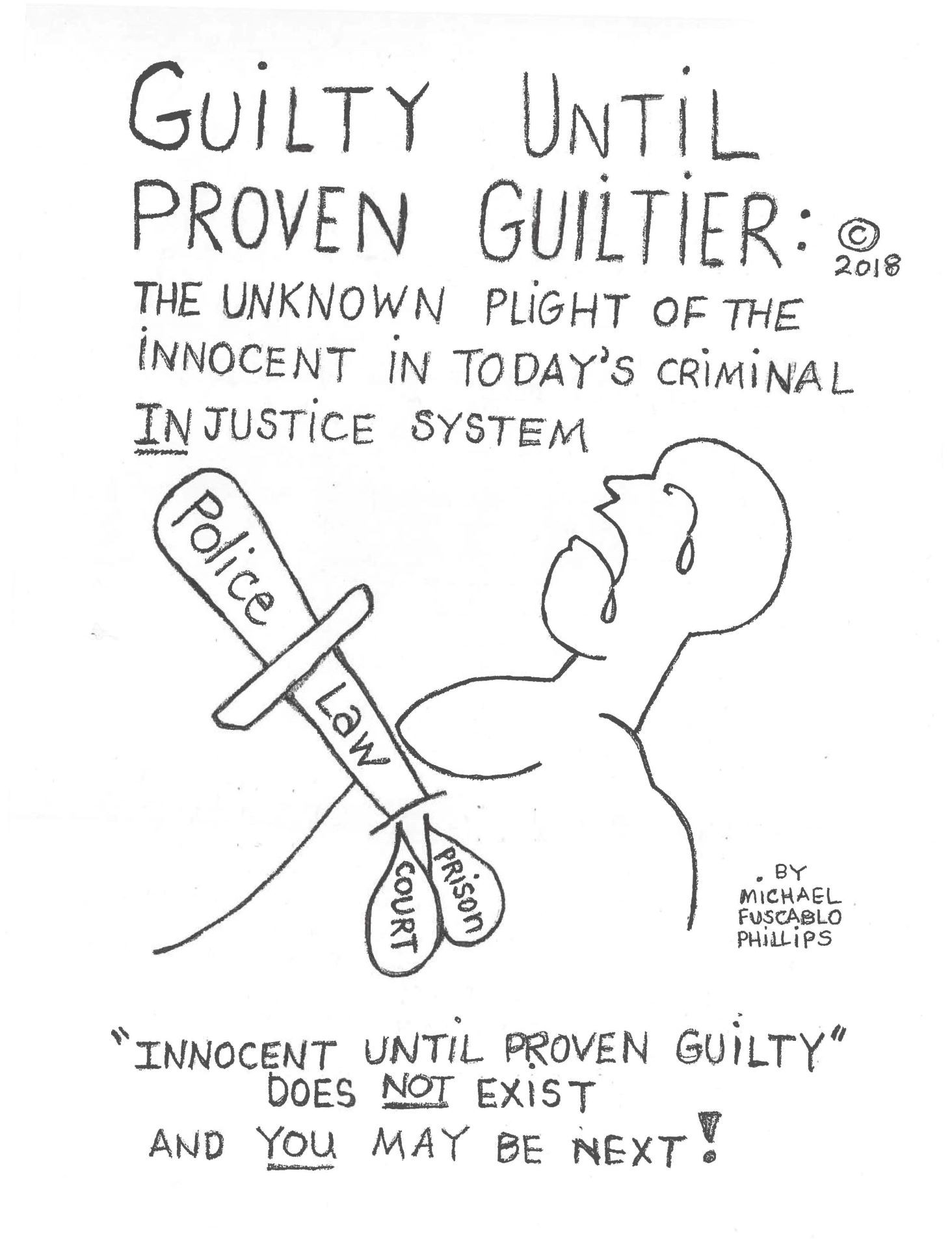 Artwork depicting the experience of the justice system, reading "Guilty until proven guiltier: the plight of the innocent in today's criminal INjustice system". By Michael Phillips