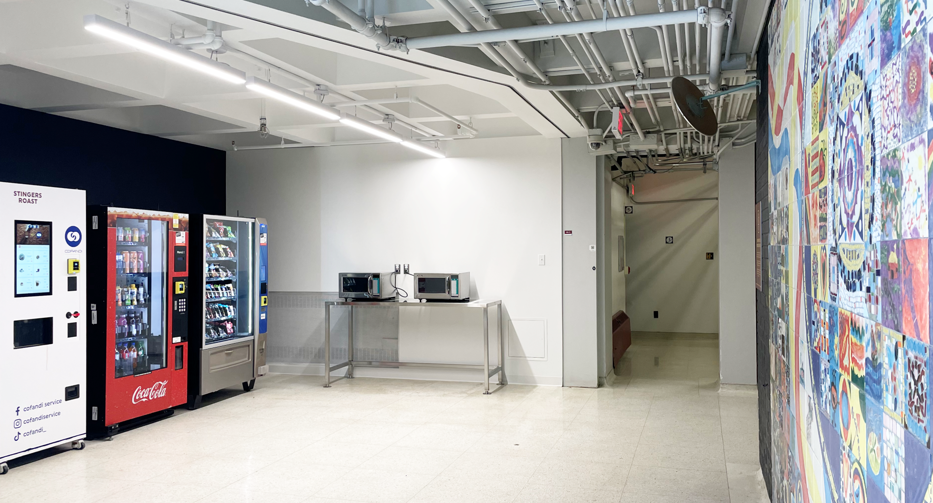 • Vending: Satisfy your cravings with our diverse vending options. Indulge in tasty treats like chips, candy, gum, nuts, and cookies. Need a boost? The Concordia student-run Cofandi coffee machine offers Concordia’s Fair Trade Stingers Roast Coffee for that perfect pick-me-up. Prefer a cold drink? Choose from refreshing juices, fizzy sodas, bubbly water, and energizing sports drinks.
