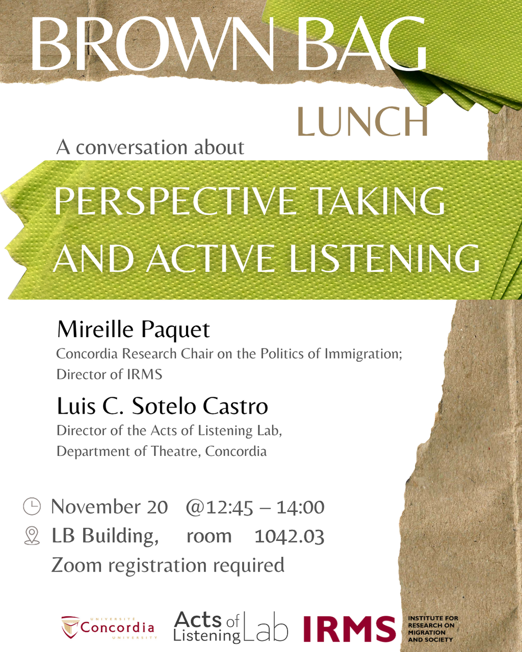 This Brown Bag Meeting will be an informal, lunchtime conversation between Mireille Paquet (Concordia Research Chair on the Politics of Immigration; Director of IRMS) and Luis C. Sotelo Castro (Director of the Acts of Listening Lab, Department of Theatre, Concordia).