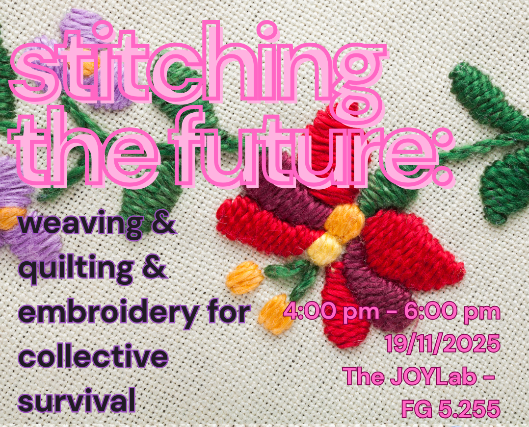 On November 19, from 4-6 p.m., please join us in the JOYLab (FG 5.255) for a community-centred workshop where participants create hand-stitched patches and embroidery that imagine futures beyond extraction, domination, and erasure.