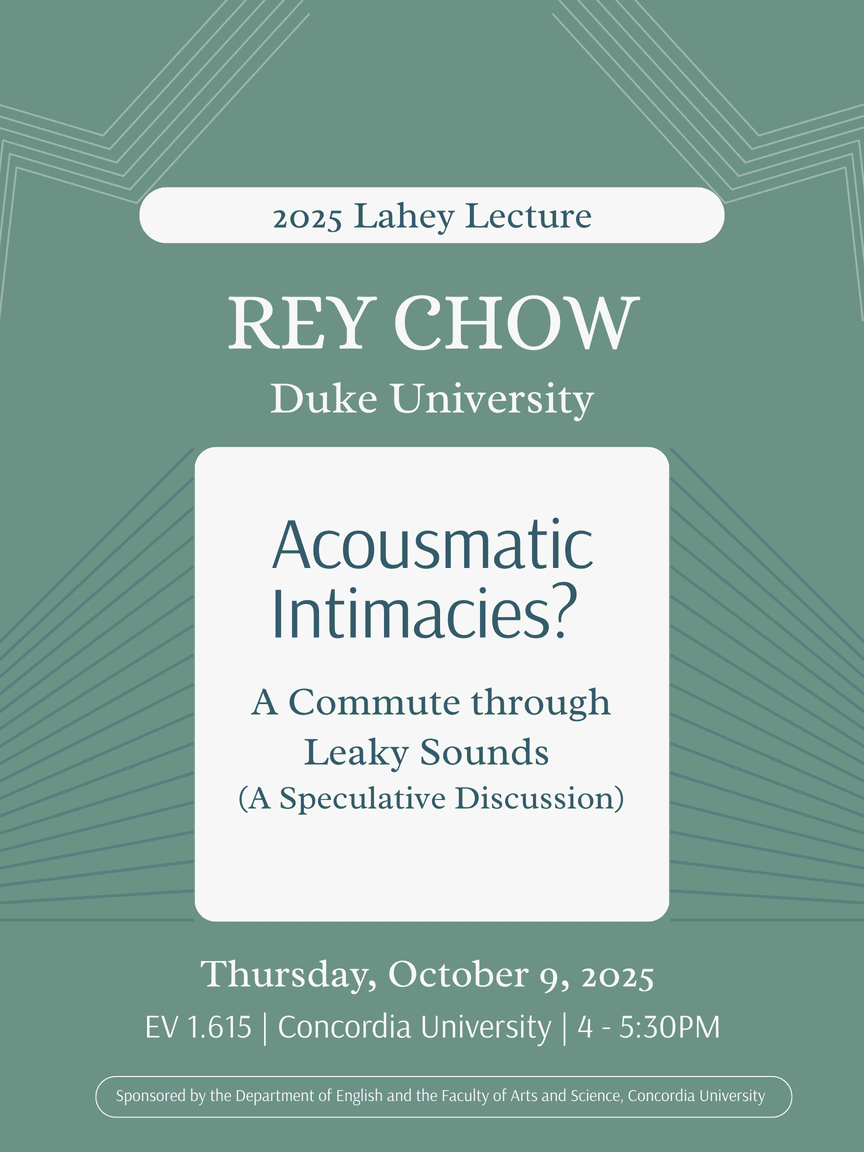 The Department of English is delighted to announce the 2025 Lahey Lecture by Professor Rey Chow (Duke University). The talk, titled "Acousmatic Intimacies? A Commute through Leaky Sounds (A Speculative Discussion)," will take place on Thursday, October 9, from 4 to 5:30 p.m. in Room EV 1.615. All are welcome.