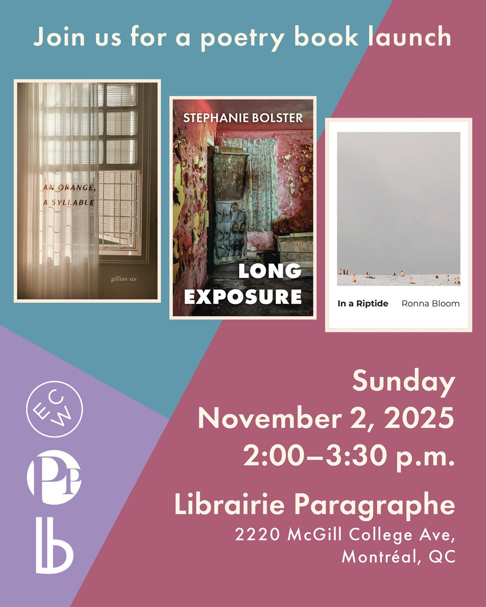 Join us for a poetry book launch. Ronna Bloom, In a Riptide Stephanie Bolster, Long Exposure Gillian Sze, An Orange, A Syllable Please register.