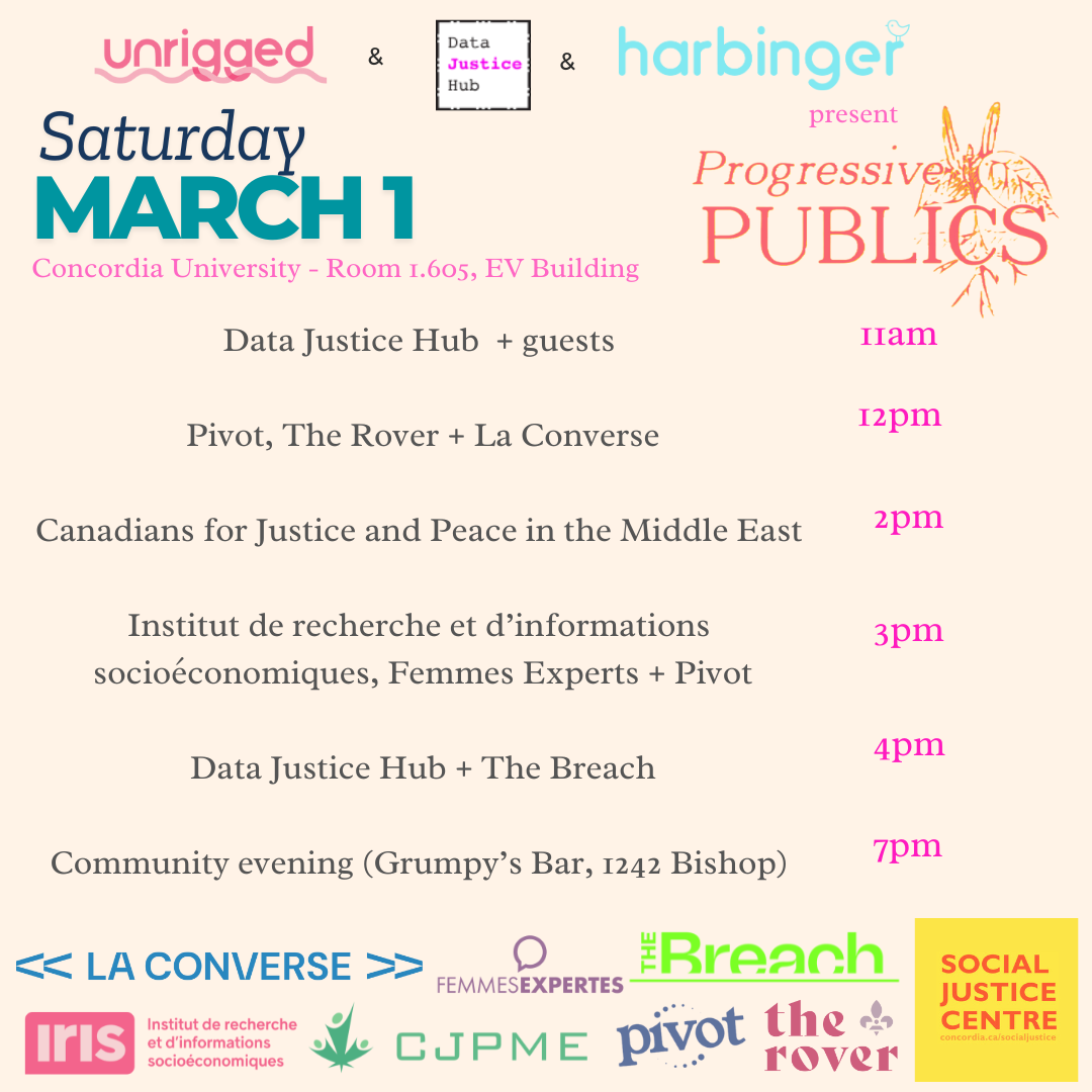 The second Progressive Publics Symposium will take place in Montreal on February 28th and March 1st, hosted by Dr. Shama Rangwala (YorkU) and Andre Goulet (Harbinger) and featuring interviews, academic panels and a live variety show with scholars and the independent journalism community in conversations exploring surveillance and prison abolition, Canadian media and Palestine, data justice, the future of journalism and more.