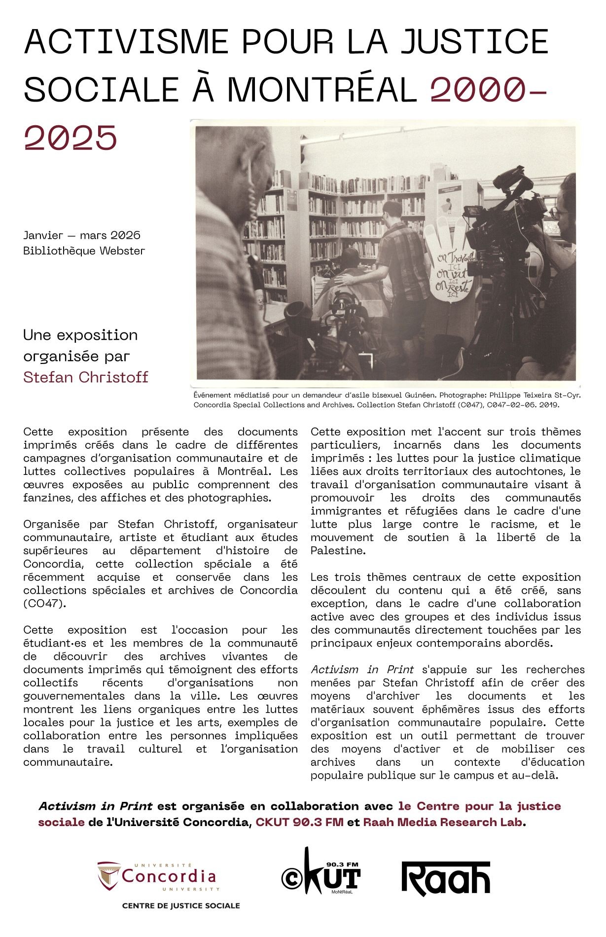 Activism in Print s'appuie sur les recherches menées par Stefan Christoff afin de créer des moyens d'archiver les documents et les matériaux souvent éphémères issus des efforts d'organisation communautaire populaire. Il est important de noter que cette exposition est un outil permettant de trouver des moyens d'activer et de mobiliser ces archives dans un contexte d'éducation populaire publique sur le campus et au-delà.