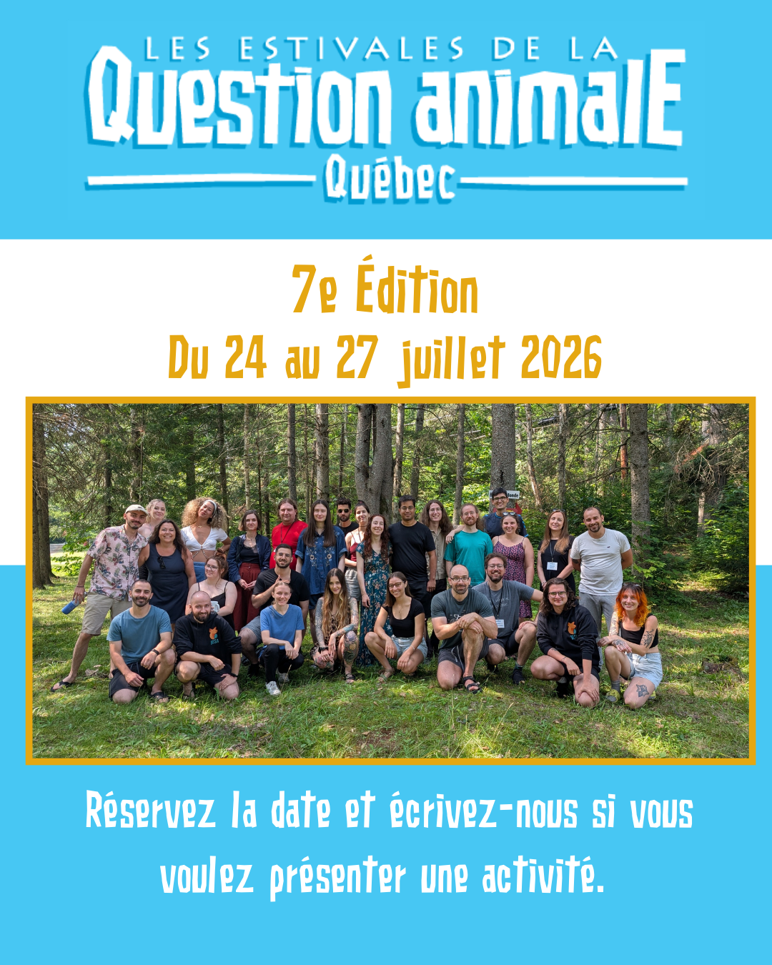 La septième édition des Estivales de la question animale au Québec aura lieu du vendredi 24 au lundi 27 juillet 2026, au Domaine Tavibois à Hérouxville (région de la Mauricie).