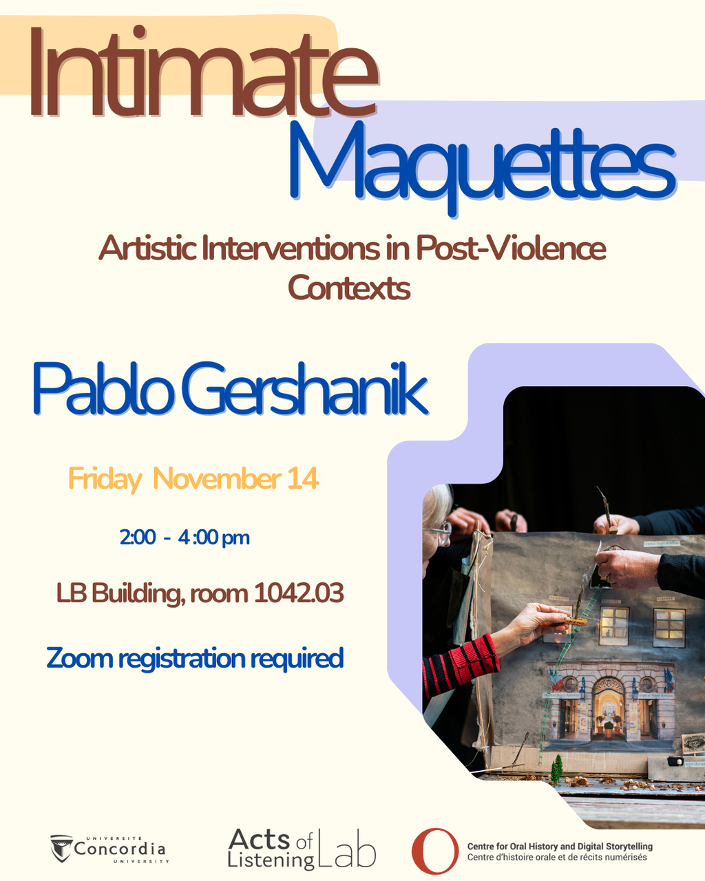 In this talk, I will share the conceptual framework of the Intimate Maquettes Lab, situating it within applied theatre, object-based performance, and trauma-informed artistic placemaking. I will also share aspects of my research motivated by key moments that have emerged throughout labs developed across Europe, North America, and Latin America, reflecting on the methodological and ethical challenges of working at the intersection of memory, art, and social repair.