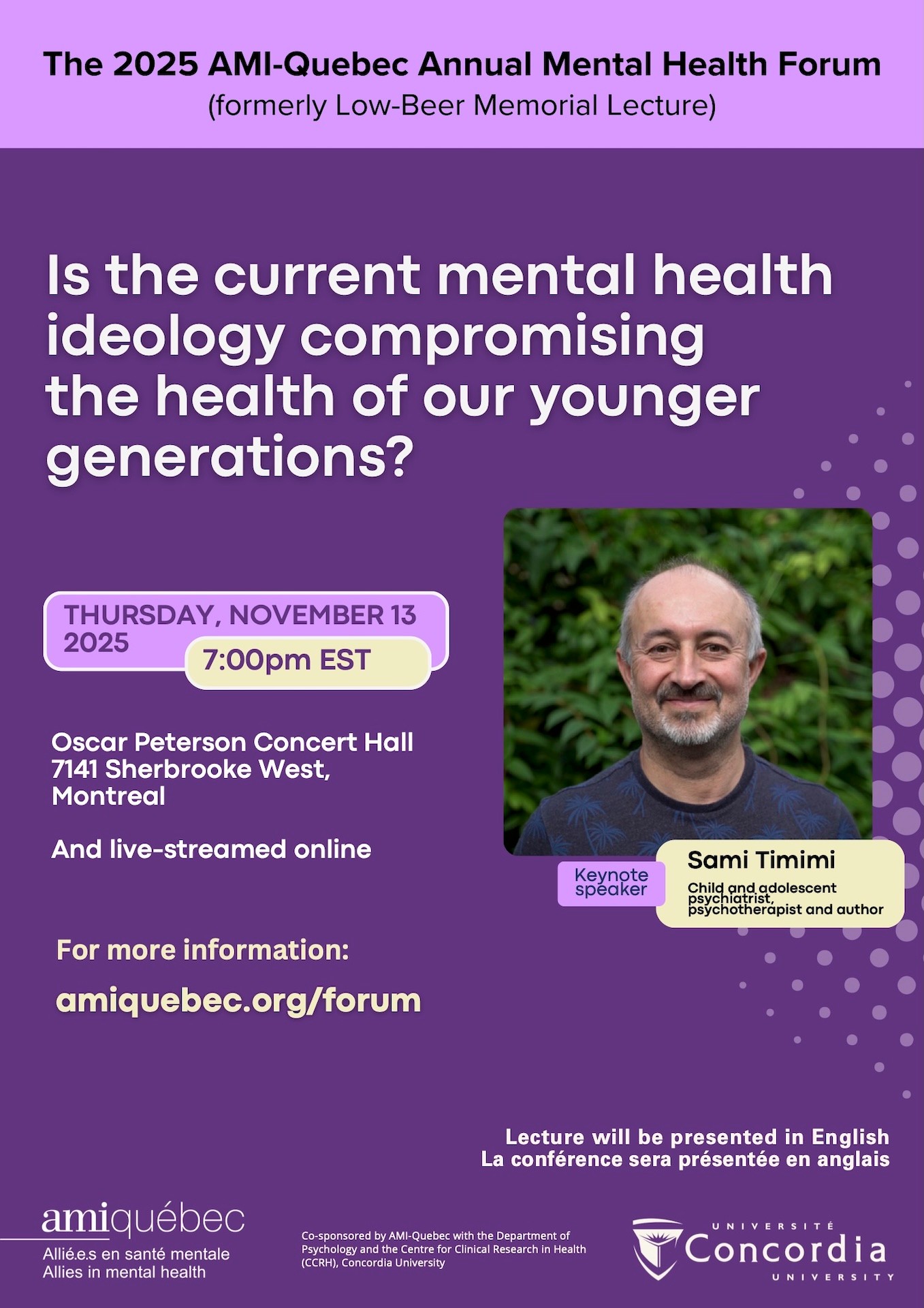 Sami Timimi, a child and adolescent psychiatrist, psychotherapist and author of the new book Searching for Normal: A New Approach to Understanding Mental Health, Distress, and Neurodiversity, is the keynote speaker at the AMI-Quebec Annual Mental Health Forum.