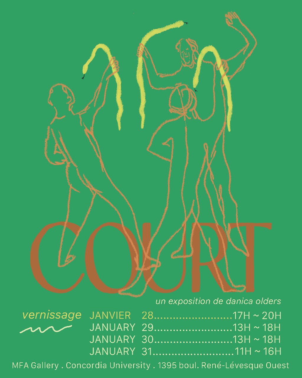 Join us for the presentation of Danica Olders' MFA Thesis Exhibition: COURT. The show will take place at Concordia's MFA Gallery in the Visual Arts (VA) building from January 28 to 31, with the Vernissage on January 28.