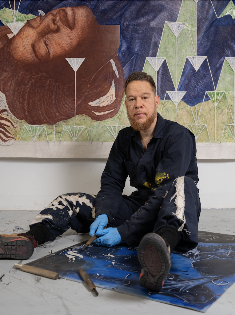 In his multi-media practice, Yashua Klos explores themes of identity, memory, and African Americans’ relationship to American labor. His large-scale works are created through intricate woodblock prints and monotypes, forming multi-dimensional, fragmented compositions that reimagine Blackness beyond traditional collage. Rather than using ready-made materials, Klos generates all source imagery through printmaking, assembling figures that exist within intertwined networks of history, myth, and lived reality. He received a BFA from Northern Illinois University and an MFA from Hunter College. His work has been presented internationally, including the major solo exhibition Yashua Klos: OUR LABOUR at the Wellin Museum of Art, and is held in several public museum collections. Klos lives and works in New York.