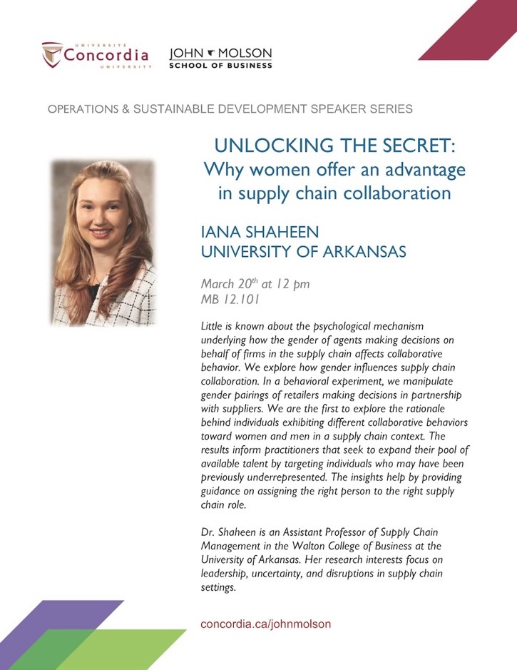 Iana Shaheen is an Assistant Professor of Supply Chain Management in the Walton College of Business at the University of Arkansas. Her research interests focus on leadership, uncertainty, and disruptions in supply chain settings.