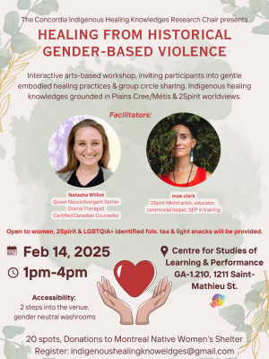 Tout d'abord, le 14 février, le CEAP s'associe à la chaire Indigenous Healing Knowledges de l'Université Concordia pour présenter un atelier interactif spécial basé sur les arts, intitulé Healing from Historical Gender-based Violence, qui invitera les participants à des « pratiques de guérison incarnées et douces et à un partage en cercle ». L'événement sera animé par Natasha Williot et moe clark.