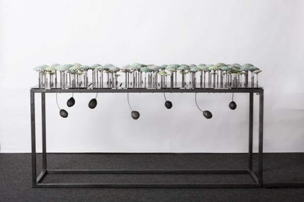 Taking home a prize of $10,000, Proulx was thrilled to be announced as the winner of the 3rd Annual RBC Emerging Artist People's Choice Award. Like much of her work, her piece, entitled Jardinet Mécanique explores objects and environments inspired by the natural world that merge with architectural environments to reopen our perception of natural phenomena. The piece incorporates the use of porcelain, glaze, steel, springs, motors, microcontroller and an electronic circuit.