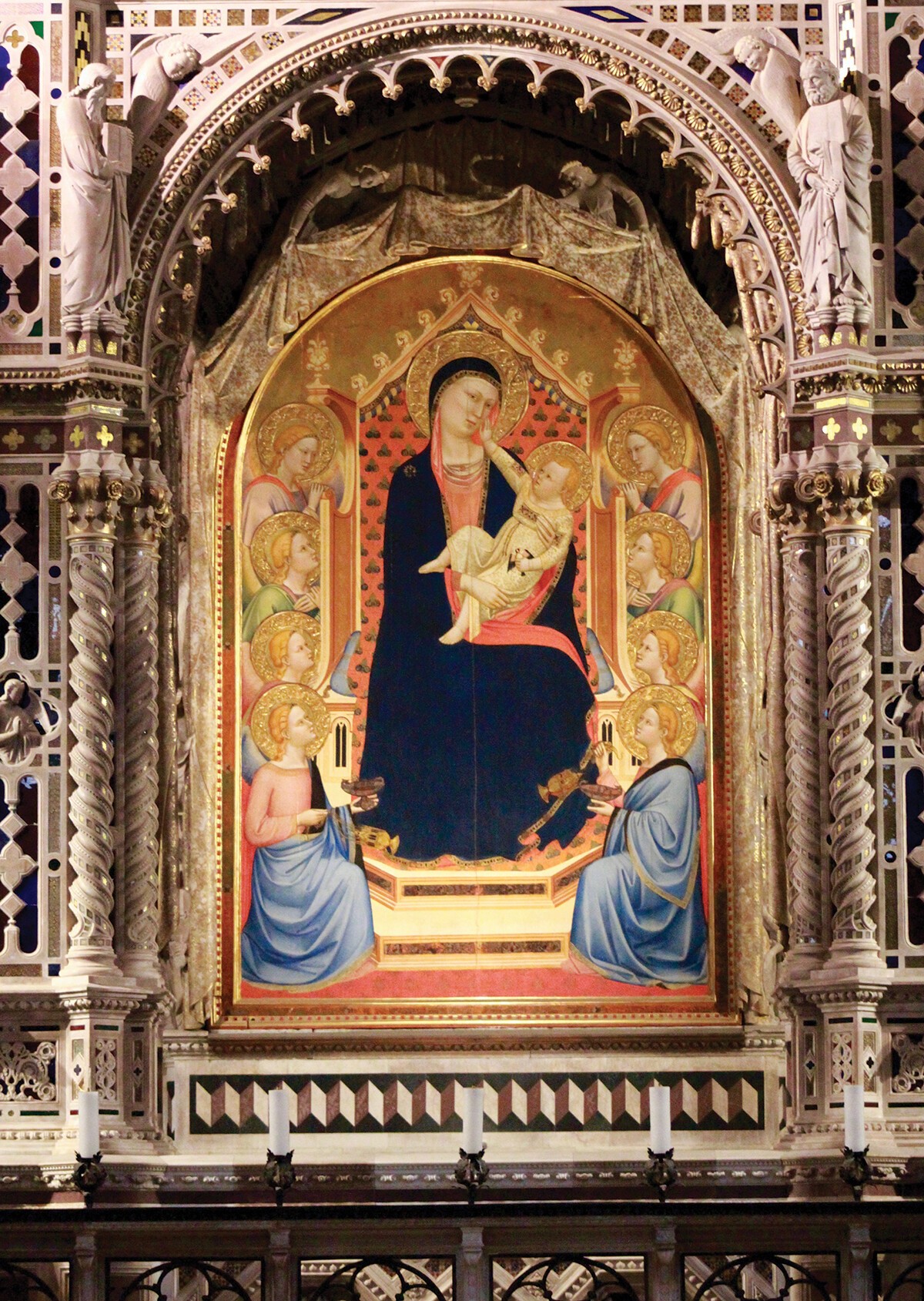 Bernardo Daddi, The Virgin and Child Enthroned with Eight Angels, c. 1347, Florence, Orsanmichele. Shown within: Andrea di Cione (Orcagna) and workshop, Tabernacle of the Virgin, c. 1359, Florence, Orsanmichele. Photo by Steven Stowell
