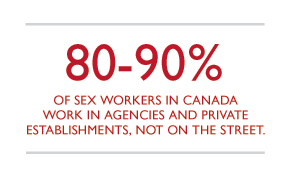 By most estimates, only 10 to 20 per cent of sex workers solicit clients off the street. The majority — 80 to 90 per cent — work from home, brothels and private establishments such as escort agencies, strip clubs or massage parlours.