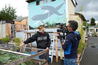 Eric Weissman videotapes a resident of Dignity Village. | Photo courtesy of Nigel Dickson