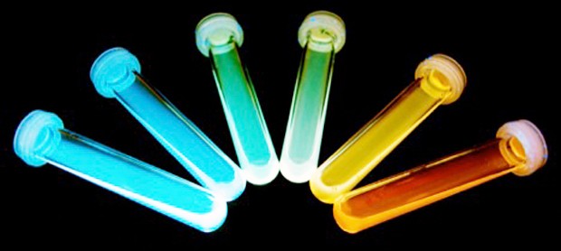 Pictured are test tubes containing carbon dots (light-emitting luminescent nanoparticles) with optical emission spanning blue to red. | Image courtesy of Rafik Naccache.
