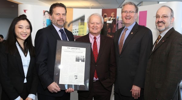 From left: Katherine Yutong Liu, MBA student; Steve Harvey, dean of the John Molson School of Business; Sebastian van Berkom, BComm 69, president and CEO of Van Berkom and Associates; Concordia President Alan Shepard; and Bram Freedman, vice-president, Development and External Relations, and Secretary-General, Concordia. Dean Harvey holds a commemorative recreation of student newspaper The Georgian. | Credit: Joe Dresdner