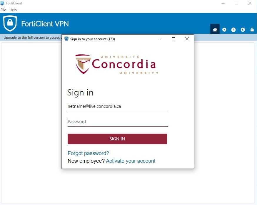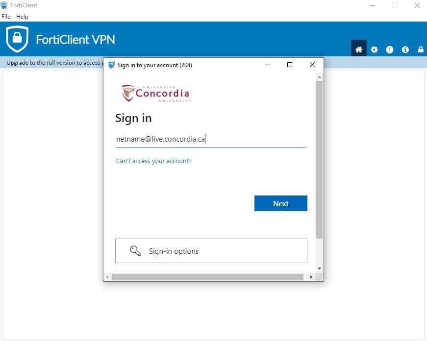 For all students, please use netname@live.concordia.ca when signing into the VPN.