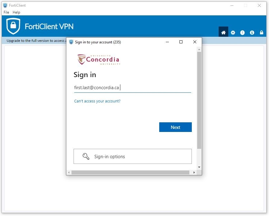 Sur le premier écran, vous devrez saisir votre adresse de courriel de Concordia. À titre de référence, l’adresse de courriel des membres du corps professoral et du personnel est prénom.nomdefamille@concordia.ca et celle des membres de l’effectif étudiant est prénom.nomdefamille@live.concordia.ca.