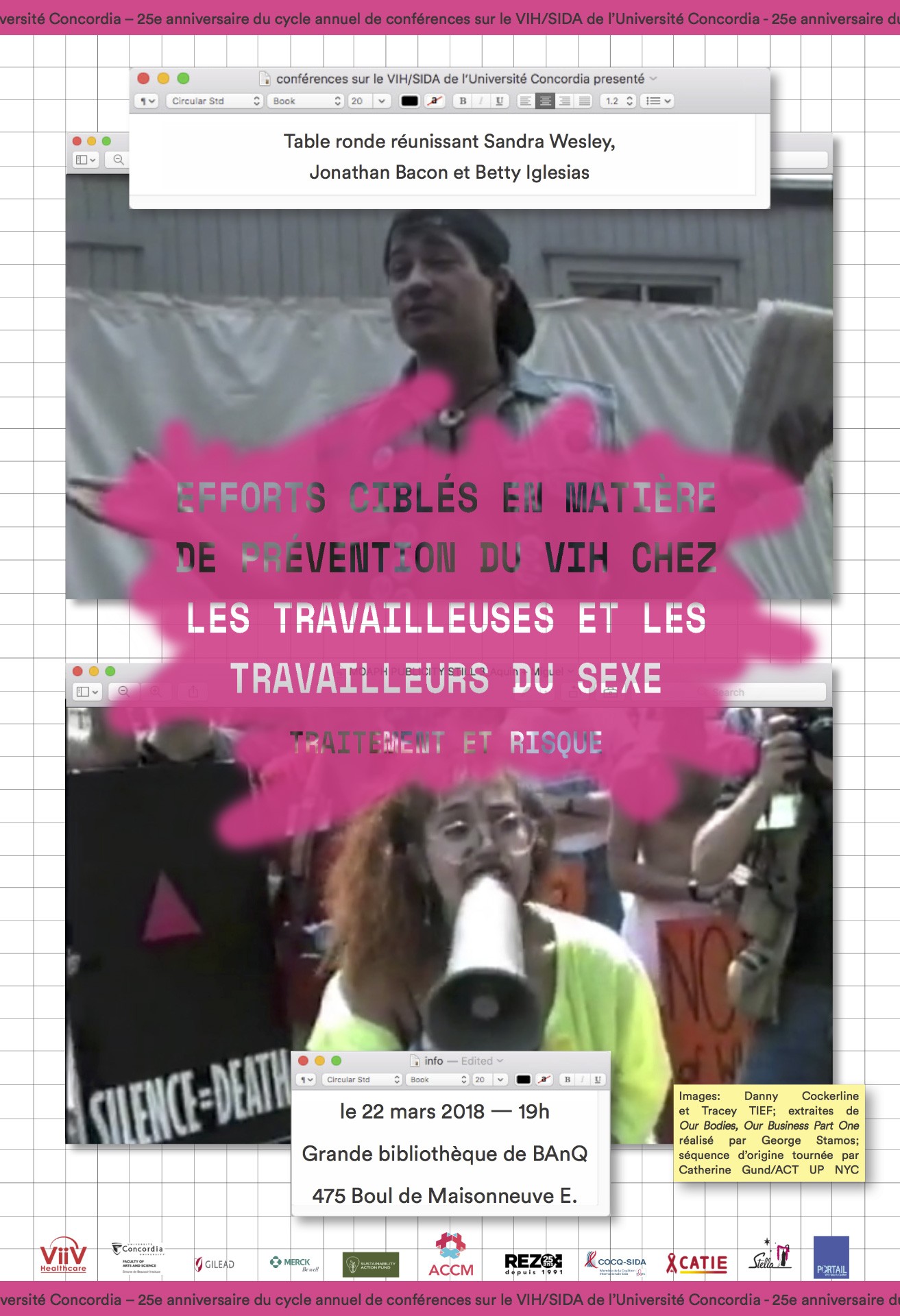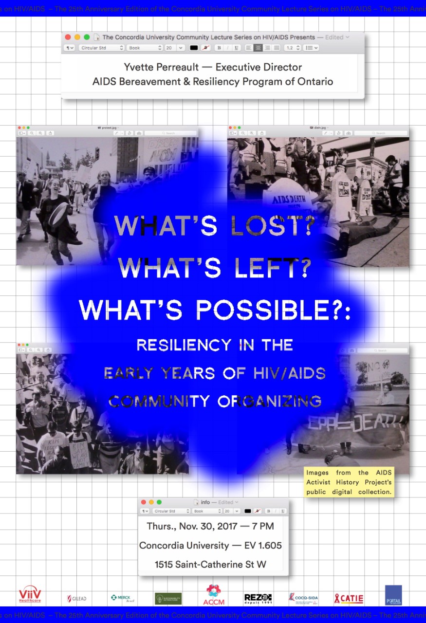 To celebrate the 30th Anniversary of the AIDS Community Care Montreal, this panel discussion will explore the past, present, and future of this essential HIV/AIDS service organization. Representatives from different generations and departments of the organization will discuss ACCM's response to the shifting contexts of the pandemic, with a particular focus on its current programs, initiatives, and challenges. To help elucidate these various stages of ACCM’s history, this panel will feature re-stagings of selected scenes from the acclaimed play written by alumni of Concordia’s Department of Theatre and the Interdisciplinary HIV/AIDS Course, Casey Stainsby, Amy Collier and Adjani Poirier, On Life and Living. Based on interviews of past and present ACCM members, staff and volunteers, On Life and Living weaves together a story of the organization’s history using memories as a primary source. The play follows eight semi-fictionalized characters over a period of twenty-eight years as they recall their first encounters with the organization, experience some of ACCM’s pivotal moments, and grapple with the changing face of HIV/AIDS in Montreal. Through a combination of performance and testimonial, this panel will provide audience members with a thorough understanding of the organization’s development, its current initiatives and challenges, and its hopes for the future. The panel will be followed by a reception.