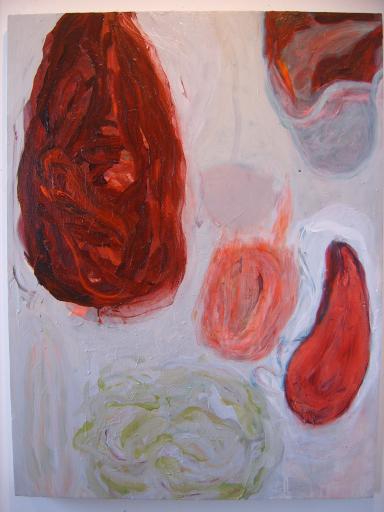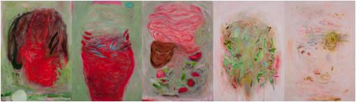 Image credits (left to right): "Well hello there", "Adèle here", "What do you think", "In this body where I live", "Is there really a need to...?" (2010 - 11, acrylic on canvas, 152 cm x 107 cm)