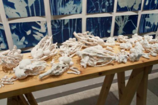 Pétrification (troisième version), ceramics installation, vegetable matter, paperclay, clay, glazes, variable dimensions, 3 white pine tables, 36x 18 x 72 " each, 2007 to 2009 | background: Parcelles de temps sauvage (deuxième version),102 cyanotypes developed on Somerset paper, 15 x 11" each,total dimensions: 270 x 70 ", 2005 to 2009