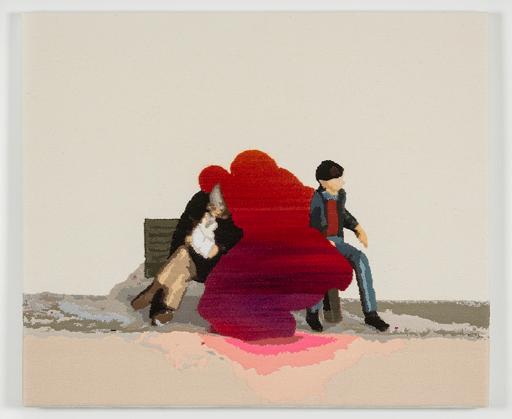 Looking at today’s social context and being inspired by the meticulous study of historical textile works, my research lies halfway between craft traditions and digital technology. While working in the studio, I explore the notion of conceptual thinking through a material practice. My woven and embroidered pieces aim at revealing the many relationships between the private world of the home and the public one that is offered by the city and the Internet. I weave and embroider the fine line between discomfort and anticipation, between presence and the concept of non-places, making portraits of characters sitting on benches, of passersby, to materialize the new and peculiar relationships that form in public spaces.