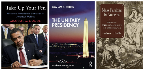 Much of Professor Dodds’s research concerns American political development and the U.S. presidency. He is the author of three books on those subjects: Mass Pardons in America explores the use of amnesties after rebellions, The Unitary Presidency analyzes the controversial constitutional theory of the unitary executive, and Take Up Your Pen examines the evolution of executive orders and other unilateral presidential directives. He also studies the use of governmental apologies for political reconciliation, and he has published dozens of journal articles and chapters in edited volumes on various aspects of American politics, US-Canada relations, comparative politics, and political theory. He has presented his work at academic conferences over 80 times.