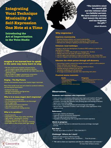 The poster presentationwill feature a brief overview of the history of improvisation in singing; possiblecauses for its noticeable absence in today’s music curricula; a more detailed listof the skills that are used and thus developed during improvisation such asaudiation, pre-phonatory tuning, motor ability, concentration and selfawareness; sight reading, and for those who wish to try, experiential examplesof some of MfP’s basic improvisation exercises; suggestions on how to initiateand facilitate improvisation activities; and finally, a list of resources thatteachers can consult if they wish to further explore the art of improvisation, and/orcreate a course of practical study for one-on-one lessons and group classes.