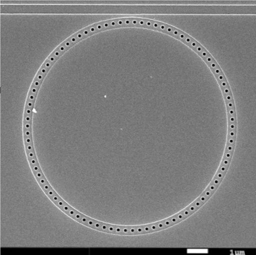 Scanning electron microscope image of a photonic crystal ring resonator fabricated on the Silicon-on-Insulator platform.