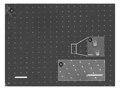 Scanning electron microscope images of patterned nanorods on silicon substrates. Panel A is a view from the top, while insets B and C are 60-degree-tilted views. The Scale bars indicate 1 µm for A and B, and 200 nm for inset C.