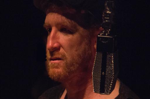 A headshot of a man in dark clothes with red hair and a beard beside a 50s style microphone