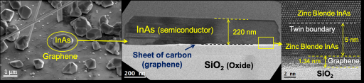 Left: Plan-view SEM image of InAs islands grown on Graphene/SiO2, Middle: Cross-sectional TEM image of an InAs island, Right: Cross-sectional TEM image showing the polytypic nature of InAs