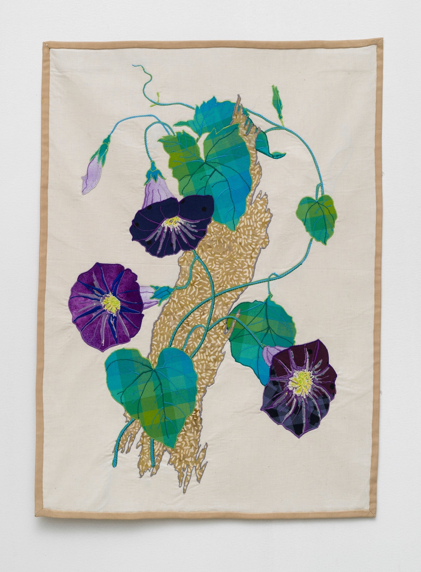 Exuberant Botanica #9: Morning Glory (After Rodarté), 2022. Vintage fabrics, cotton muslin, embroidery floss, thread. 19" x 26" . Photo by Guy L'Heureux