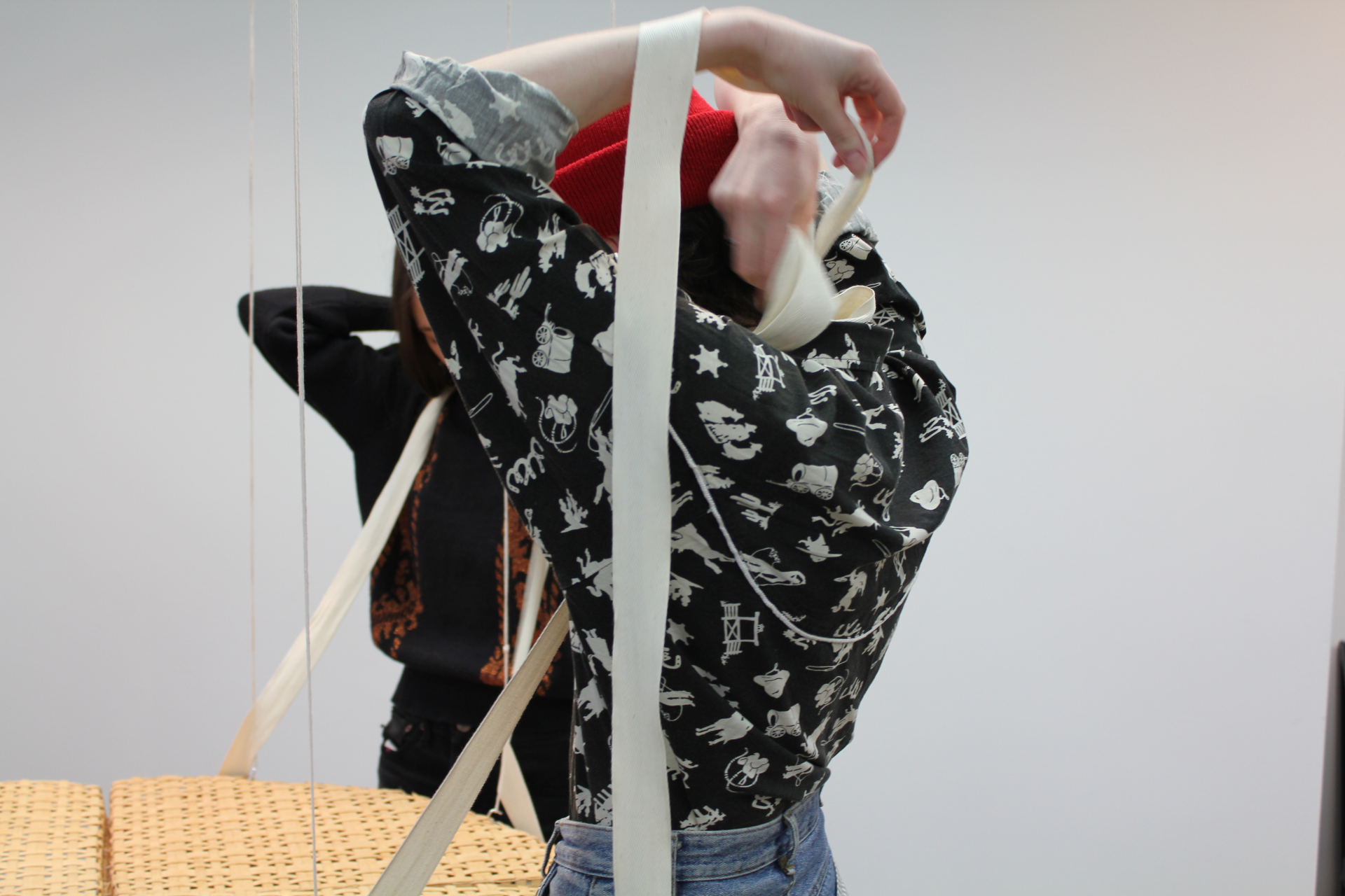 Untitled [Table] consists of four separately woven pieces of a tabletop that, when activated by four different participants, become a singular, self-supporting surface. The nature of the table requires participants to negotiate with and listen to each other in order to balance the surface between them. An exercise in unity, and a metaphor for community, this work provides participants with playful and experimental ways of sharing space and coming together.