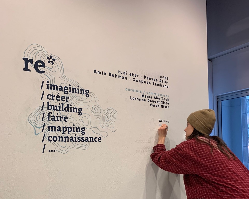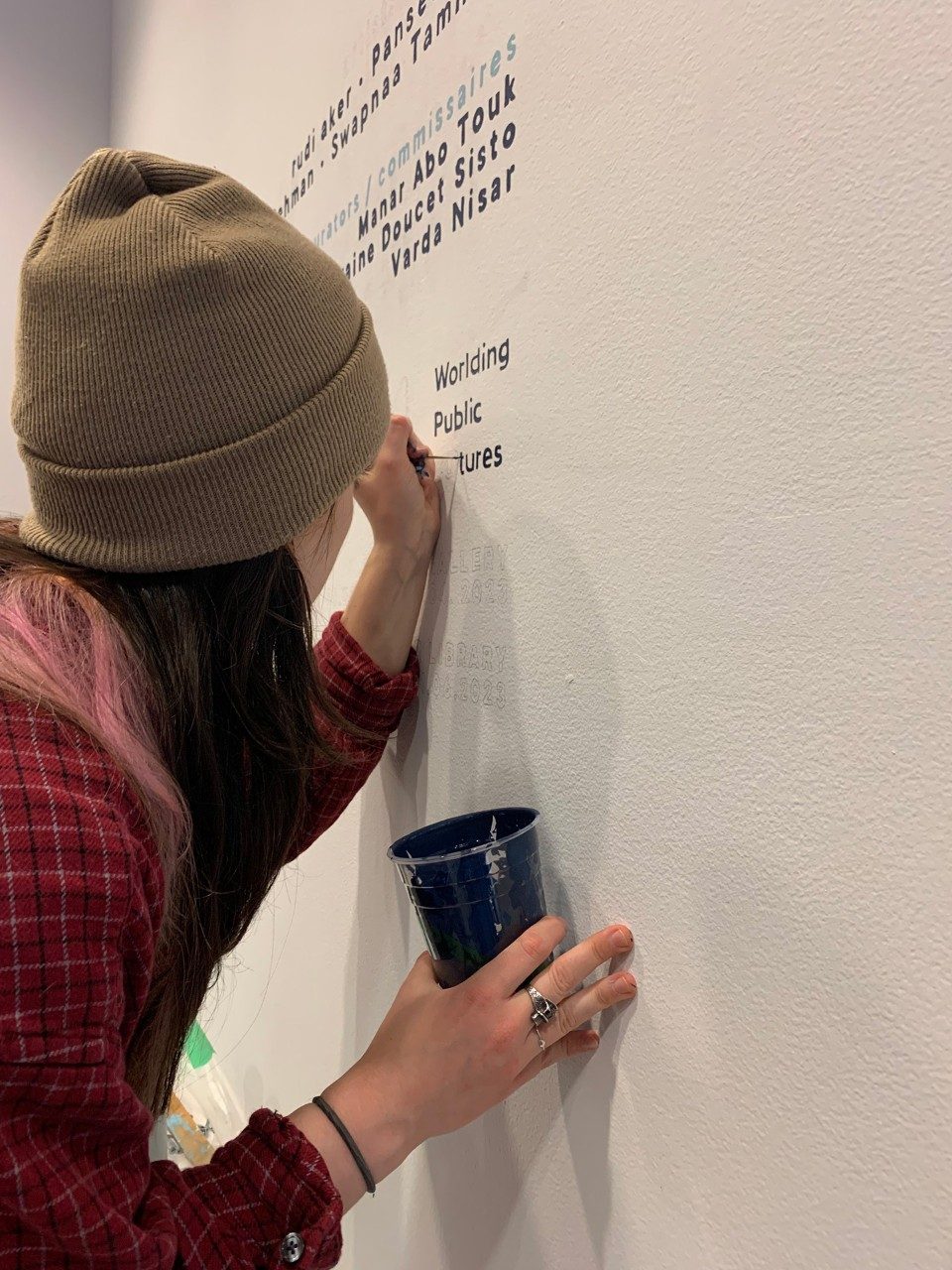 Demonstration of hand-lettering signage by Lorraine Doucet Sisto for the group exhibition re* by Worlding Public Cultures