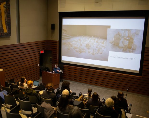 Former Curator in Sustainability Jasmine Sihra presenting during the Replacing Vinyl Workshop I that took place in March 22, 2023