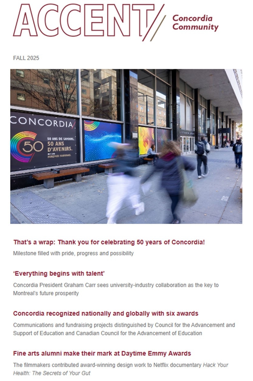 Dernières nouvelles de Concordia et de votre faculté ou école préférée, envoyées chaque mois par courriel.