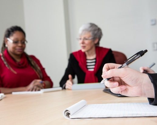 close-up of a hand poised to take notes during a group discussion