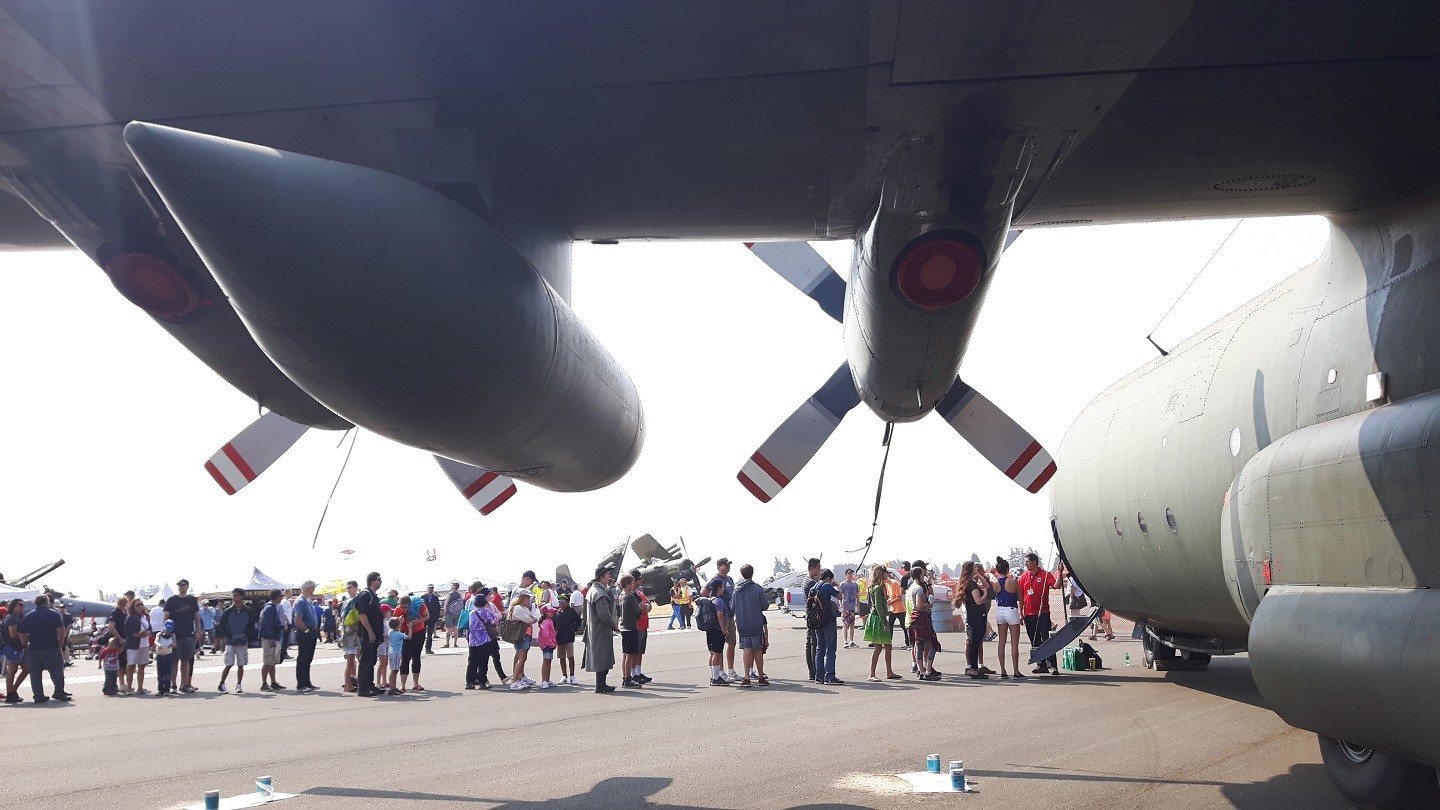 Des visiteurs du spectacle aérien d’Abbotsford attendent pour visiter le poste de pilotage d’un appareil Hercules C-130 en août 2017. Crédit photo : Andréa Cartile.