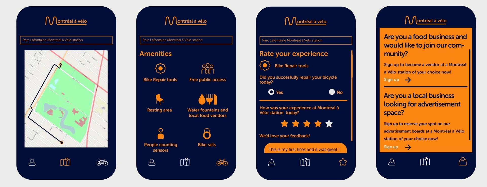 Montréal à Vélo est une agence qui installera des stations de vélos dans trois zones cyclables populaires (Parc Maisonneuve, Parc Jarry et Parc Lafontaine). Dans ces stations, les cyclistes pourront réparer leur vélo dans des ateliers bien équipés, socialiser, se reposer et acheter de la nourriture et des boissons auprès de vendeurs locaux.