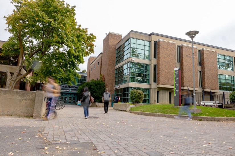 Le bâtiment est directement relié à la Bibliothèque Vanier et à d’autres pavillons du campus, et présente une œuvre d’art public, The Four Horsemen de François Houde, installée en 1989.