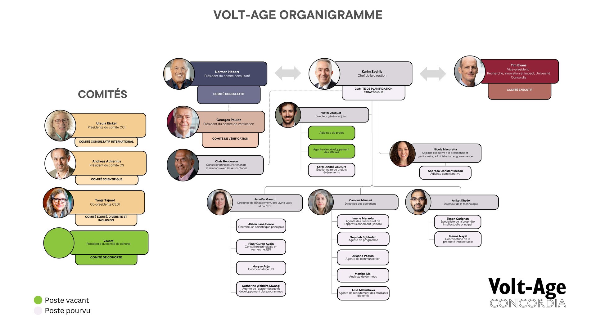 Volt-Age est dirigé par une équipe-cadre de chercheuses et chercheurs rompus à la collaboration interdisciplinaire. Une équipe administrative, des comités d’experts et un comité composé de scientifiques de haut niveau travaillent ensemble dans le cadre de ce programme de recherche à l’atteinte d’objectifs communs: la décarbonation et un avenir plus vert.