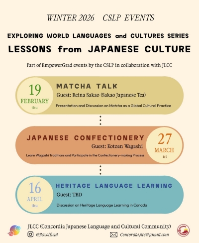 During the Winter 2026 semester, the Center for the Study of Learning and Performance (CSLP) is inviting the Concordia and Montréal communities to take part in a Japanese Language and Cultural Exchange, led by CSLP Student Affiliates (Ryuichi Suzuki & Vitor Yano) and the Concordia Japanese Language and Culture Community.