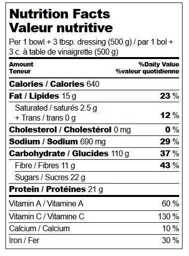 SERVING SIZE : 1 bowl + 3 Tbsp (45ml) dressing / 1 bol + 3 c. à table (45 mL) de vinaigrette