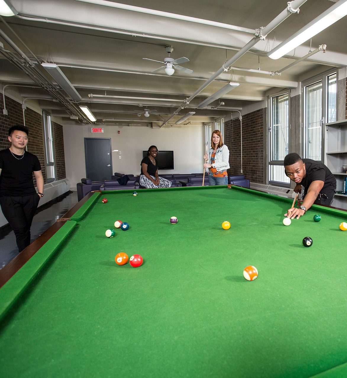 In the HA and HB building, each floor has a kitchenette with microwave, toaster, coffeemaker and kettle; laundry facilities; a lounge with cable television; and a games room with a pool table.